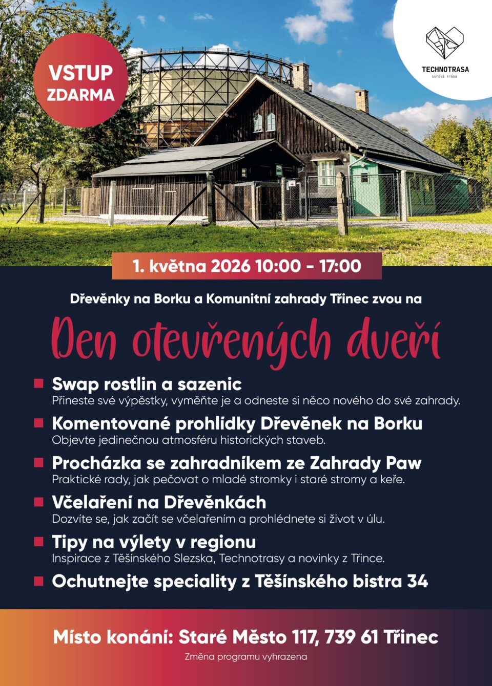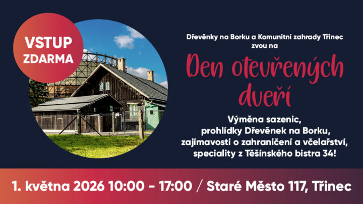 Dřevěnky na Borku a Komunitní zahrady Třinec vás zvou na Den otevřených dveří, který se uskuteční v pátek 1. května 2026 od 10:00 do 17:00 ve skanzenu Dřevěnky na Borku v Třinci.